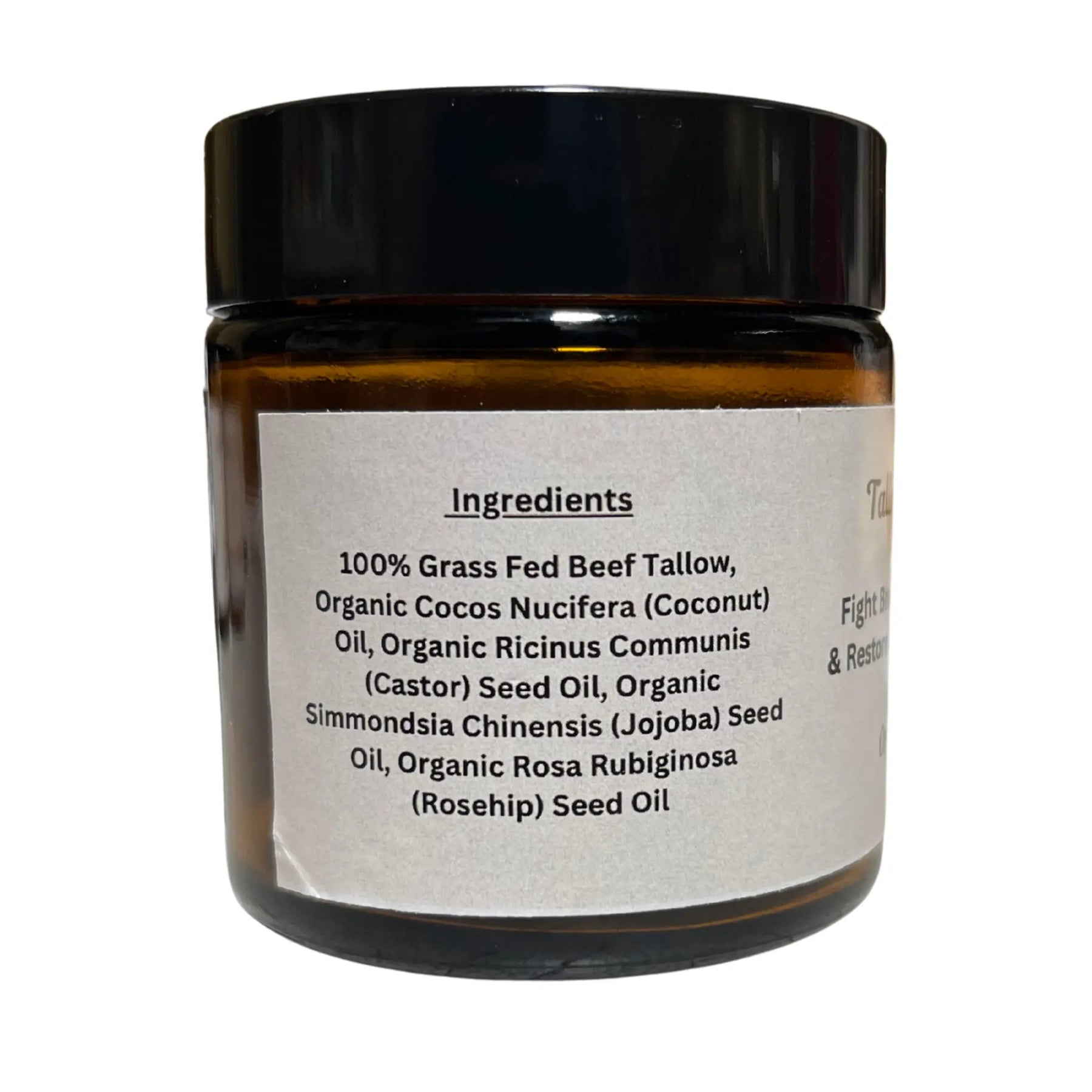 100% Beef Tallow Grass-fed, Organically Groen Castor Oil, Organic Rosehip, Organic, Jojoba Oil, Organic Coconut Oil.